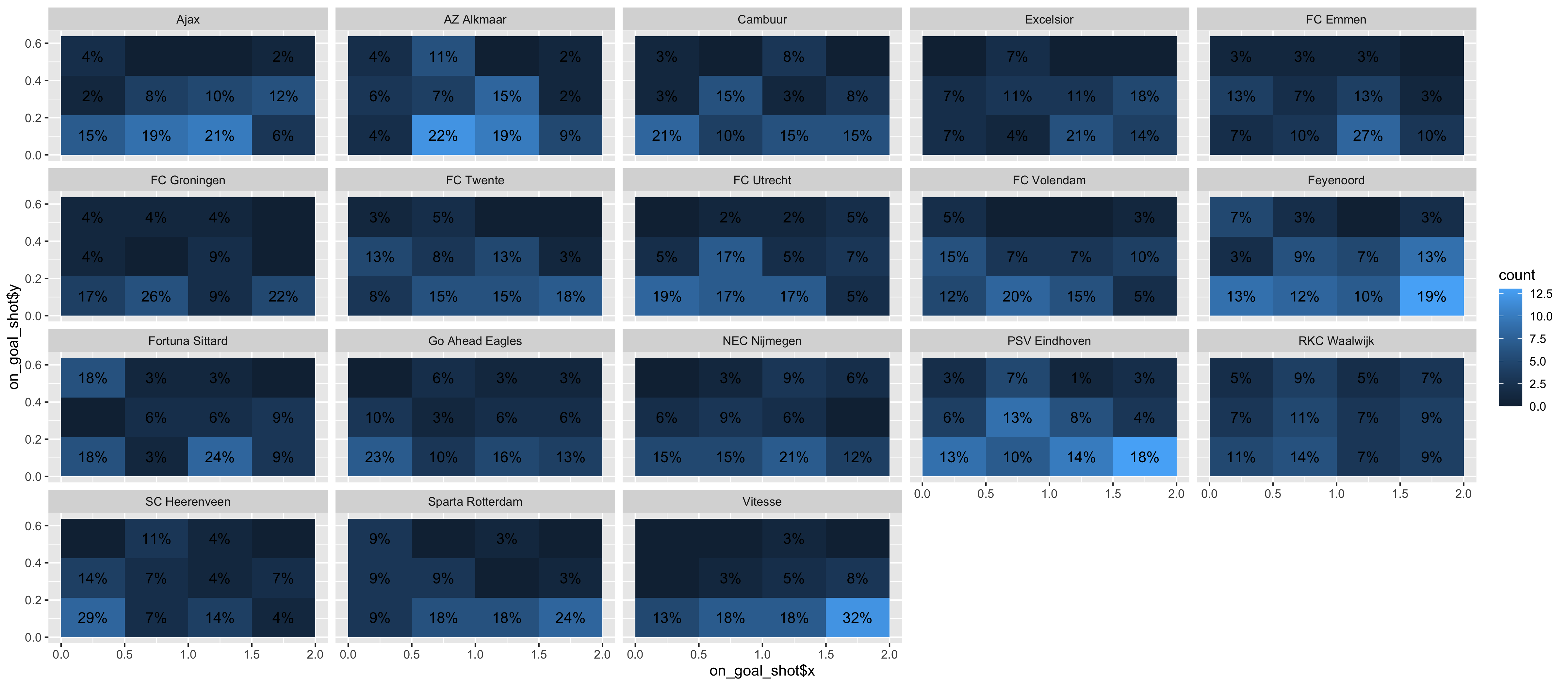 Now we’re getting somewhere! I really prefer to see how the areas correspond with each other per team though. So I’m going to add some code to print the percentage of shots in each area per team. This prints a text with the percentage in every area and the ..PANEL.. parts make sure it is the percentage per team and not per competition.