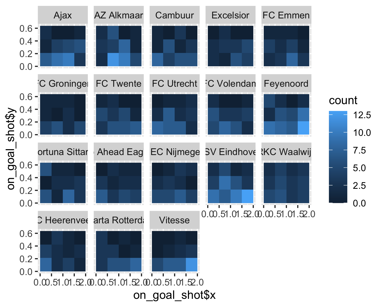Looks horrible, but the idea is clear. The most shots go to the area on the bottom, just right of the middle. To sort this by team, we can use a simple facet_wrap as you can see below.